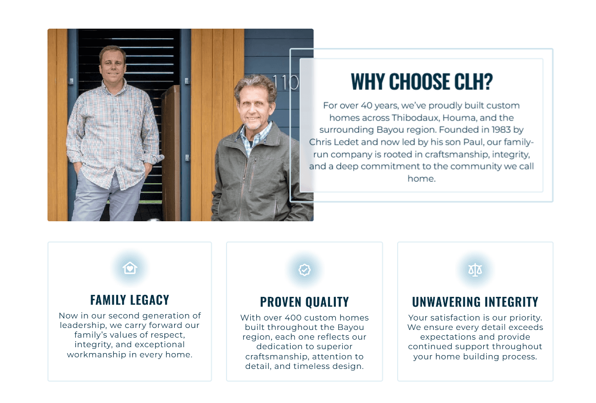 A company that builds custom homes in Thibodaux, Louisiana reached out to redesign/rebuild their site. They wanted a modern, simple design that could compete with other luxury home builders.